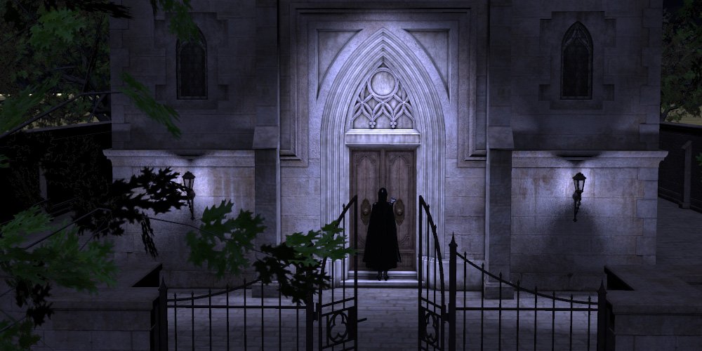 The gate hinges emit a mournful metallic moan in their failed attempt to resist being opened. The visitor is draped in a bible-black cloak and strides across the cobble stone covered courtyard. Each step is acented by hard boot heels striking stone, emitting short sharp "clops" that bounce off the masonry to finally die in the surrounding tree and leaf strewn forest. The gates have been left partially open suggesting that the visitor does not intend to stay for long. They hesitate at the foot of the massive carved wooden doors and their shoulders rise as if they have taken a deep breathe. The cloak billows as they finally rap their leather gloved knuckles on the door.